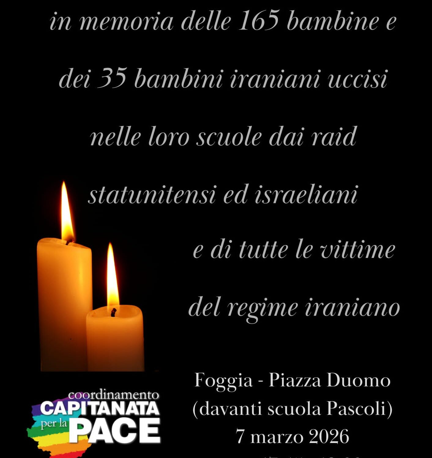 Sabato 7 marzo, dalle 17:45 alle 19:00, davanti alla Scuola primaria Pascoli di Foggia, il Coordinamento Capitanata per la Pace organizza una veglia silenziosa in memoria delle 165 bambine e dei 35 bambini uccisi in Iran nelle loro aule dai raid israelo-statunitensi e tutte le recenti vittime del regime iraniano. Una scuola per onorare chi alla scuola è stato strappato con la violenza, un vero e proprio “crimine contro l’umanità” di cui si è purtroppo parlato pochissimo. Scegliamo un silenzio che è rispetto, ma anche denuncia. L’aggressione contro l’Iran – il cui regime sanguinario denunciamo fermamente, come…