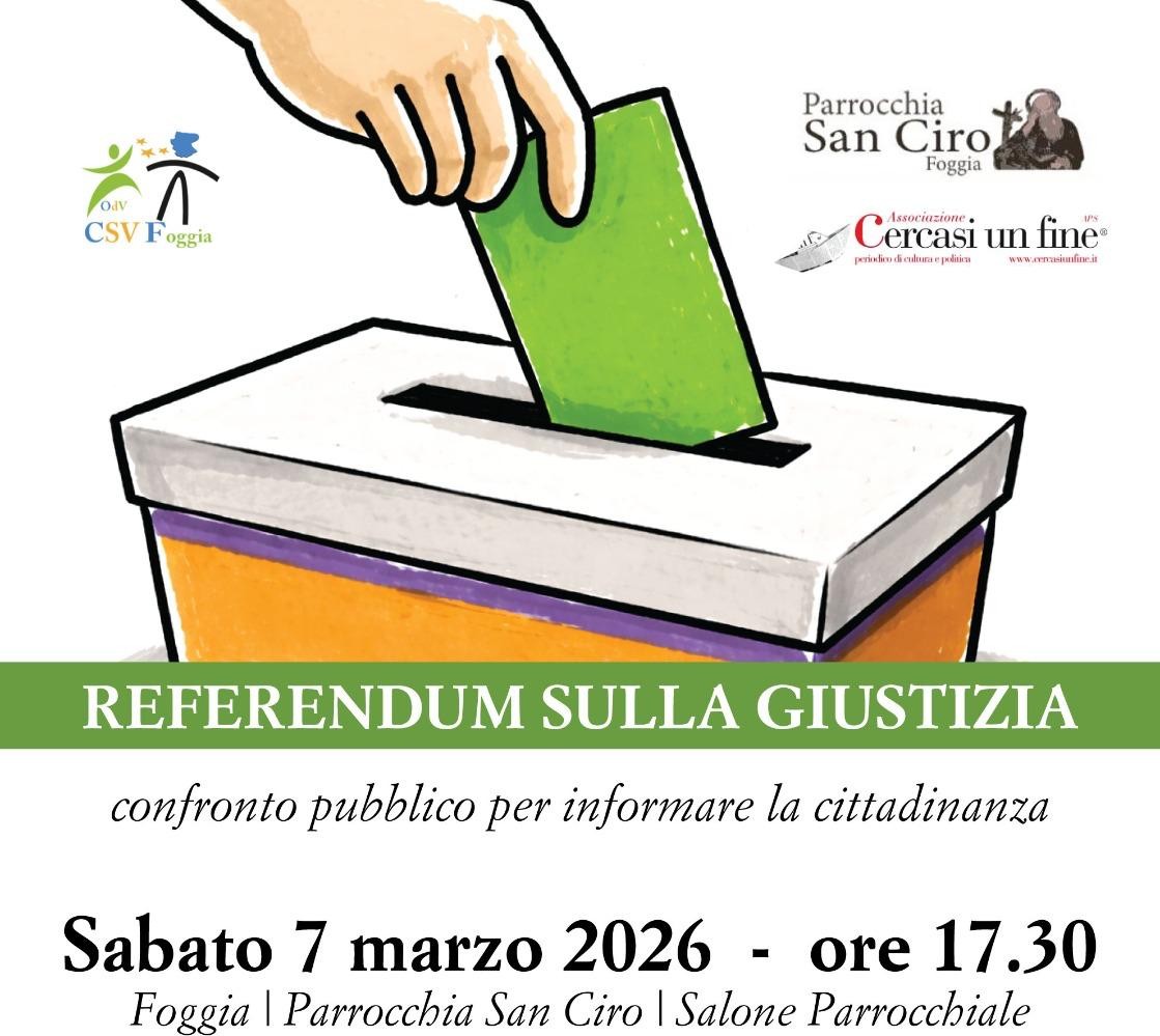 Un momento di confronto pubblico, aperto e pluralista, per approfondire i contenuti del referendum sulla giustizia e offrire alla comunità strumenti utili a una scelta consapevole. È questo l’obiettivo dell’incontro in programma sabato 7 marzo 2026, alle ore 17.30, a Foggia, presso il salone parrocchiale della chiesa San Ciro. L’iniziativa è promossa – nell’ambito delle attività della scuola politica – dalla Parrocchia, dal CSV Foggia e dall’associazione Cercasi un fine, con l’intento di favorire un dibattito serio ed equilibrato su un tema di particolare rilevanza per la vita democratica del…